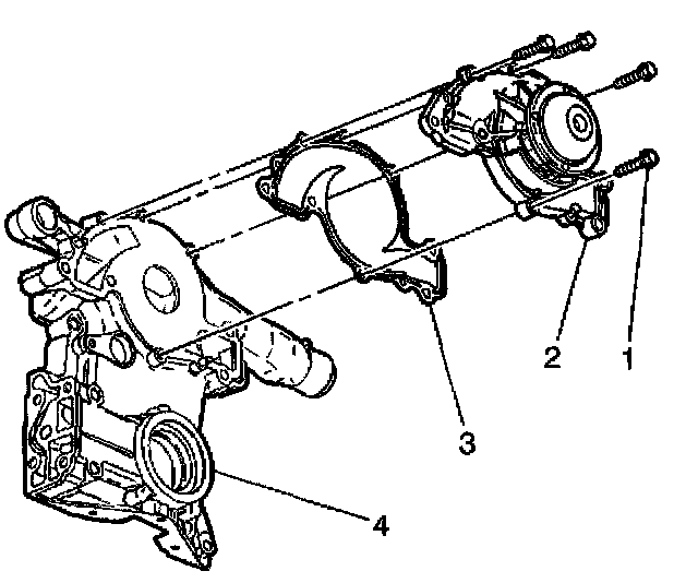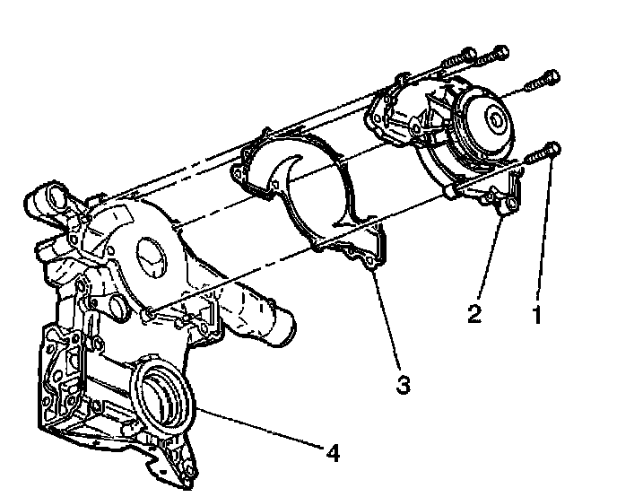 2. Install the coolant pump gasket (3) to the front cover (4).