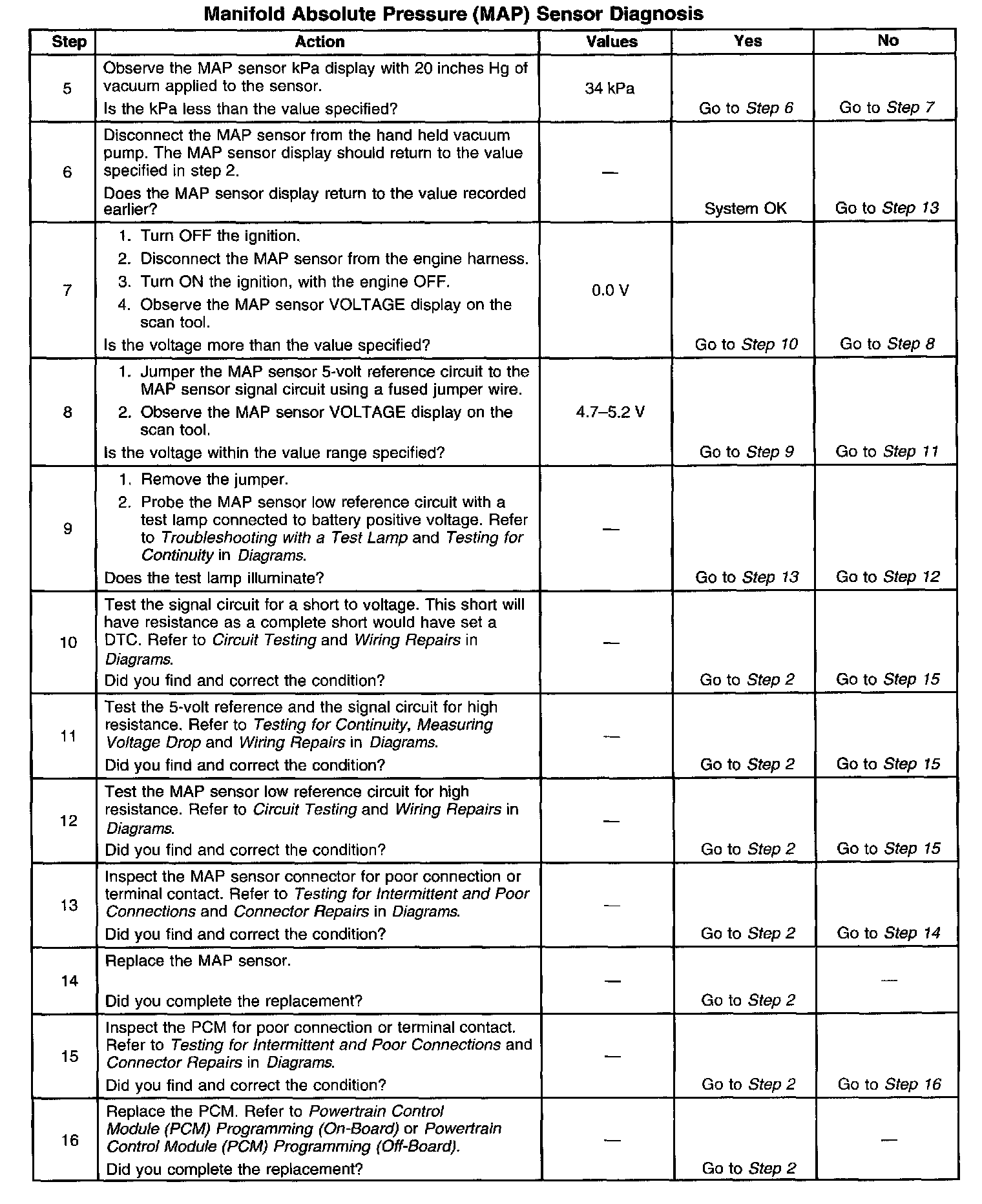 CIRCUIT DESCRIPTIONThe Manifold Absolute Pressure (MAP) sensor responds to pressure changes in the intake manifold which gives an indication of the engine load. The MAP sensor has a 5-volt reference circuit, a low reference circuit, and a signal circuit. The Powertrain Control Module (PCM) supplies 5-volts to the MAP sensor on the 5-volt reference circuit and provides a ground on the low reference circuit. The MAP sensor provides a signal to the PCM on the signal circuit which is relative to the pressure changes in the manifold. With low manifold absolute pressure such as during idle or deceleration, the PCM should detect a low signal voltage. With high manifold absolute pressure such as ignition ON, with the engine OFF or Wide-Open Throttle (WOT), the PCM should detect a high signal voltage. Certain vehicle models will also use the MAP sensor in order to calculate the Barometric Pressure (BARO) when the ignition switch is turned ON, with the engine OFF. The BARO reading may also be updated whenever the engine is operated at wide-open throttle. The PCM monitors the MAP sensor signal for voltage outside of the normal range. If the PCM detects a MAP sensor signal voltage that is excessively high, DTC P0108 will set. IF the PCM detects a MAP sensor signal voltage that is excessively low, DTC P0107 will set.