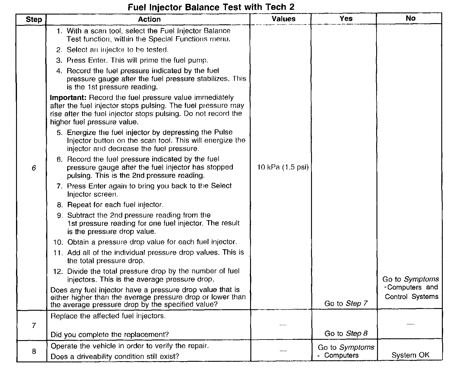 6. If the pressure drop value for each fuel injector is within 10 kPa (1.5 psi) of the average pressure drop value, the fuel injectors are flowing properly. Calculate the pressure drop value for each fuel injector by subtracting the second pressure reading from the first pressure reading.
