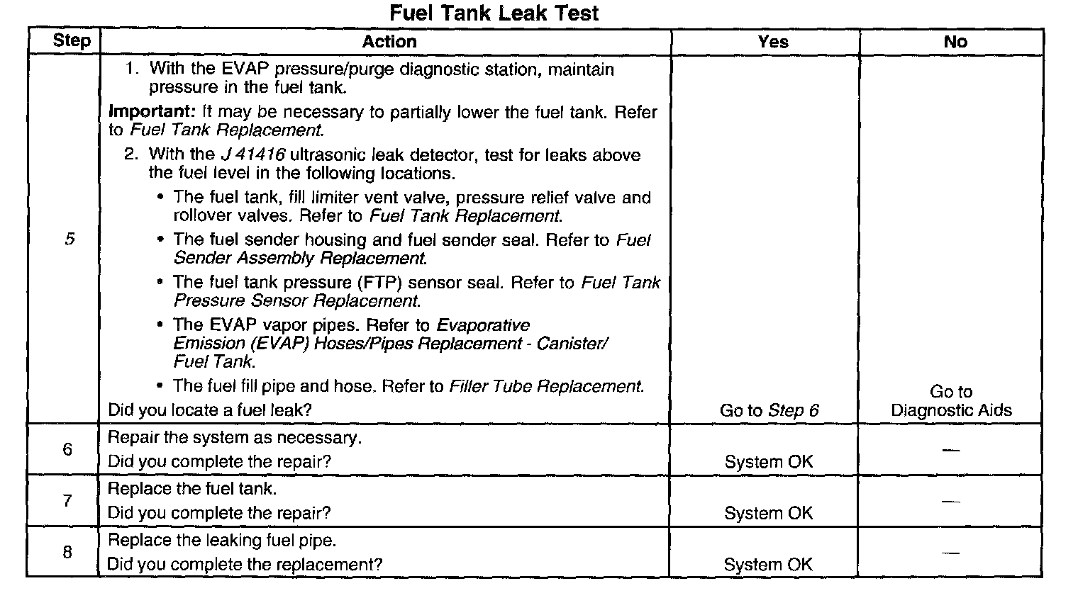 DESCRIPTIONThe fuel tank leak test is used to locate any fuel or fuel vapor escaping the fuel tank area. Fuel vapors escaping above the fuel level will be detected when the Evaporative Emissions (EVAP) leak diagnostic completes one test cycle. The Malfunction Indicator Lamp (MIL) will illuminate after the EVAP leak diagnostic completes two test cycles.