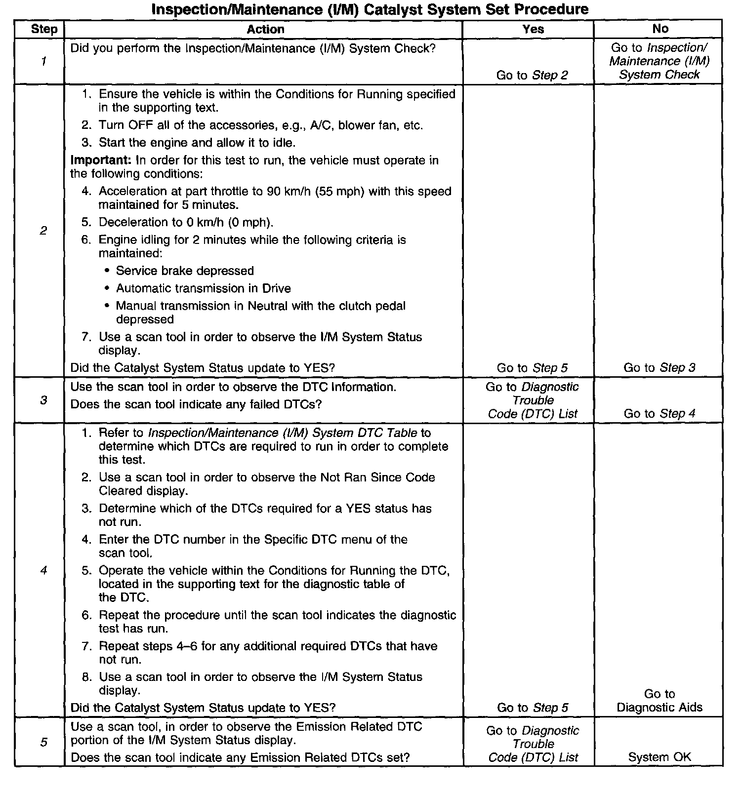 DESCRIPTIONThe purpose of this test is to satisfy the enable criteria necessary to execute I/M readiness diagnostics for the catalyst system. The test may be used to set the I/M System Status indicators to YES. Ensure the vehicle meets the requirements listed in Conditions for Running before performing this test. Failure to meet the necessary requirements may produce inaccurate test results.