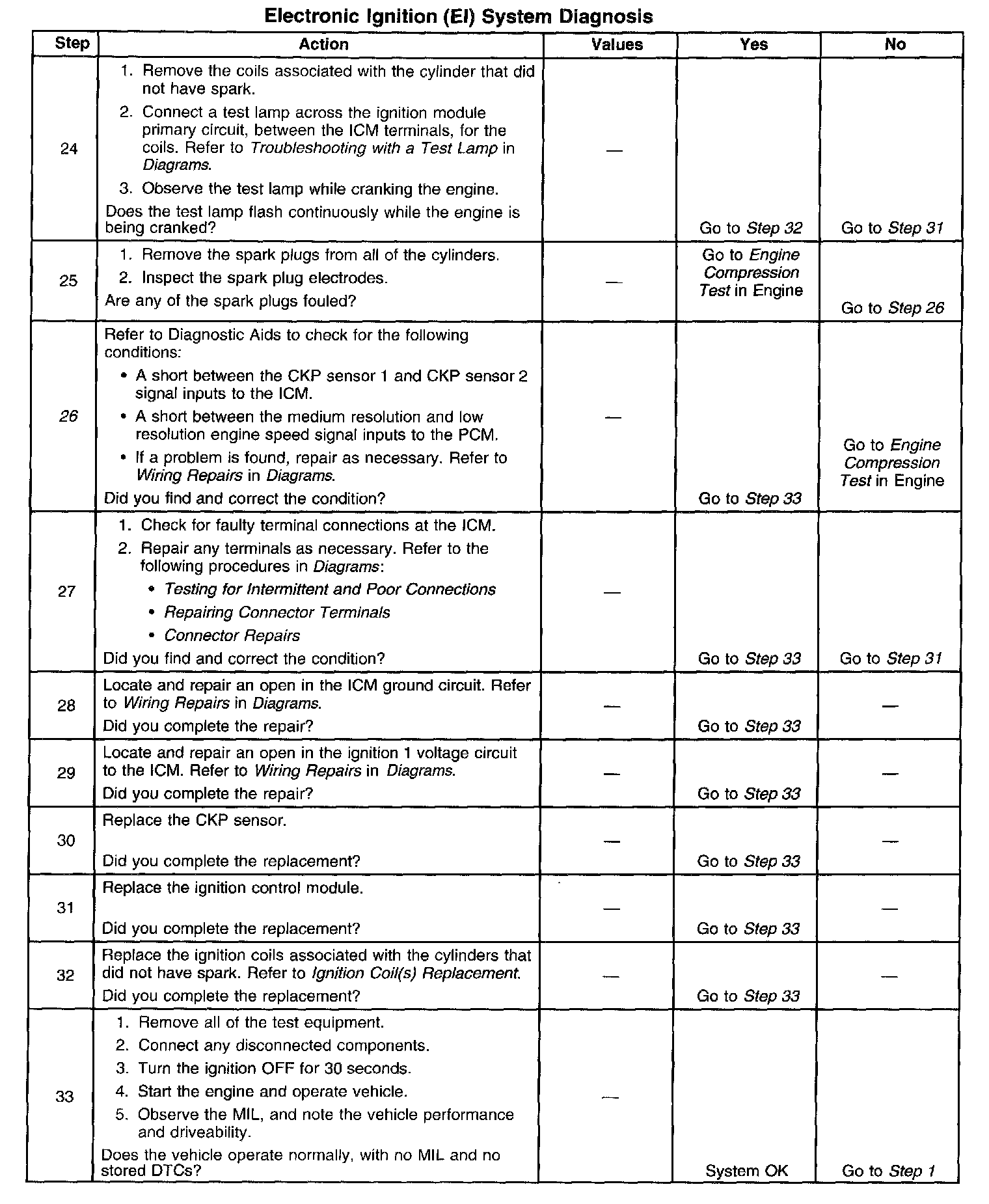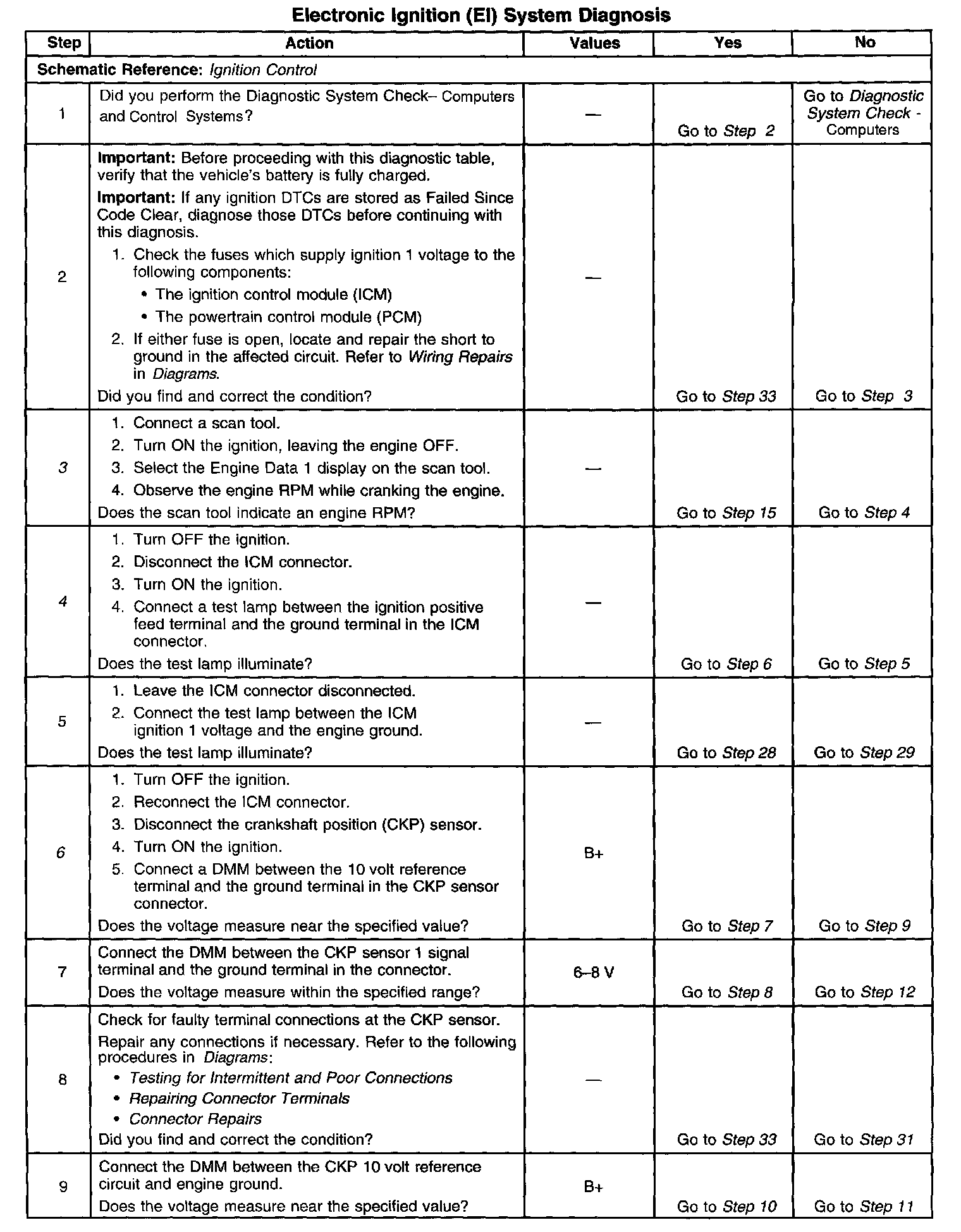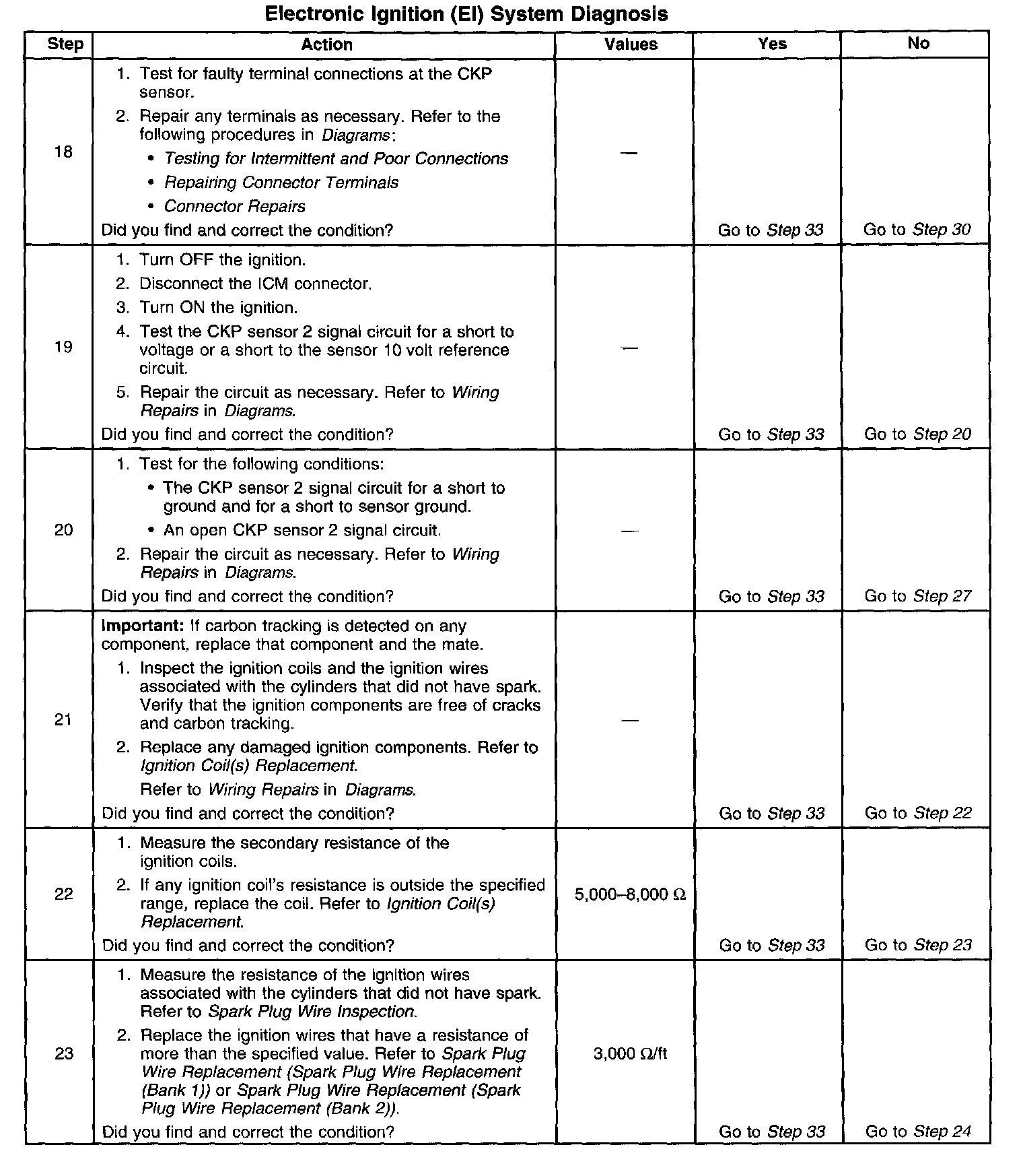 26. If the CKP sensor 1 signal and CKP sensor 2 signals to the PCM or the medium resolution and low resolution engine speed signals to the IC module short together the vehicle will not start and run. However, there will be spark and fuel injector pulses.