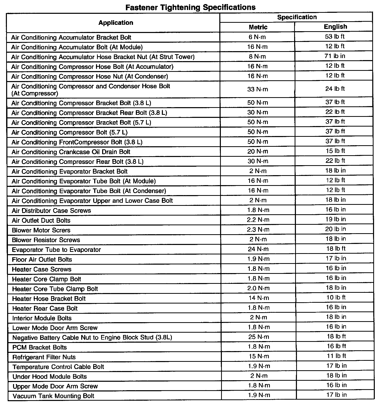 Fastener Tightening Specifications: