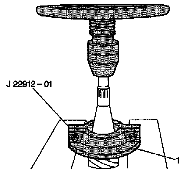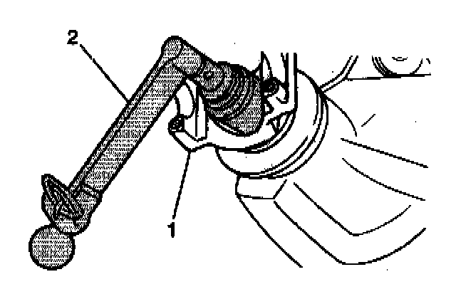 7. Apply heavy hand pressure on J22536 toward the rear axle housing (2). This pressure keeps the outer drive pinion gear (1) bearing seated in order to avoid damage to the outer race.