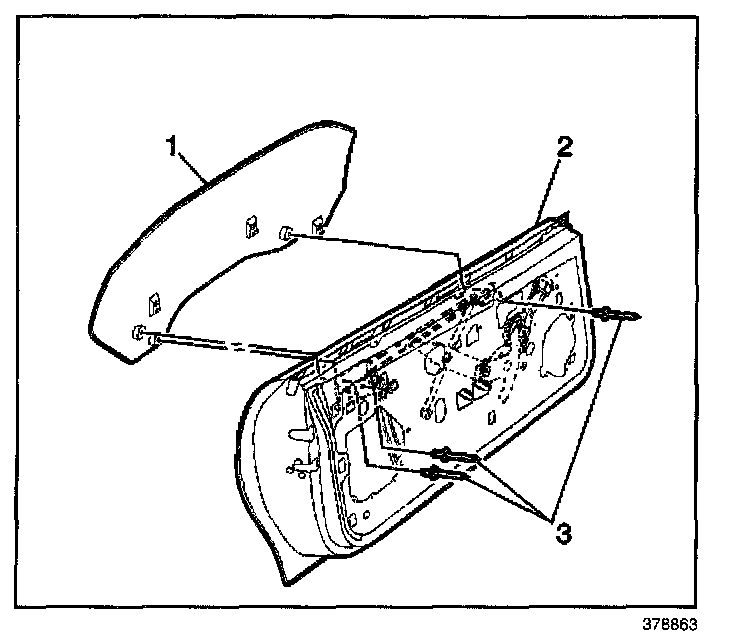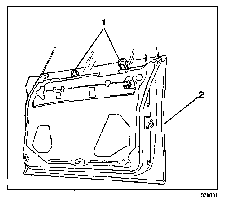 4. Support the window in a position needed to access the window rivets by inserting rubber wedge door stops (1) at the front and rear of the window between the window and the door inner panel.
