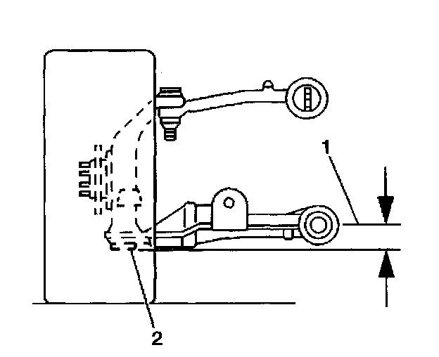 4. Use the J 42854 in order to measure the distance between the lowest point of the ball joint (2) and the center of the front side of the lower control amp mounting bolt (1).