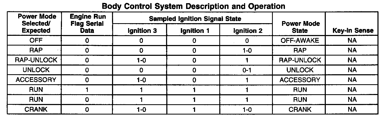 On vehicles that have several control modules connected by serial data circuits, one module is the Power Mode Master (PMM). On this vehicle the PMM is the Body Control Module (BCM). The PMM receives three signals/circuits from the ignition switch. These are the Ignition 1, Ignition 2 and Ignition 3 ignition switch signals/circuits.To determine the correct power mode the PMM uses: