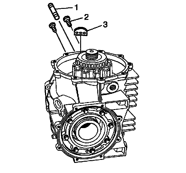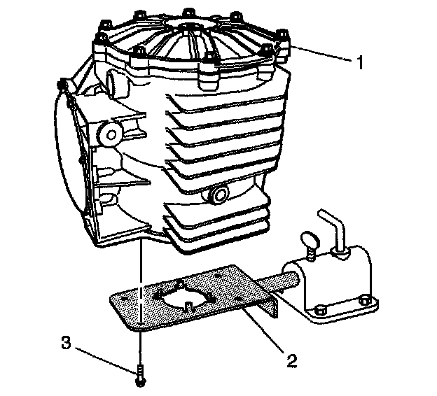 9. Apply thread locker GM P/N 1052942 or equivalent to the threads of the bolts (2) and stud (1). Apply thread locker only to the end of the stud that installs into the mount.