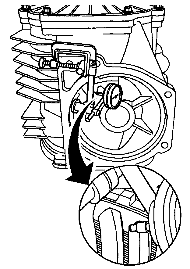 14. Install the J 8001 onto the transmission stud. Position the tip of the dial indicator against the center off the ring gear tooth surface