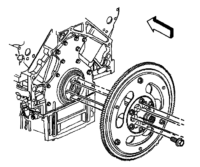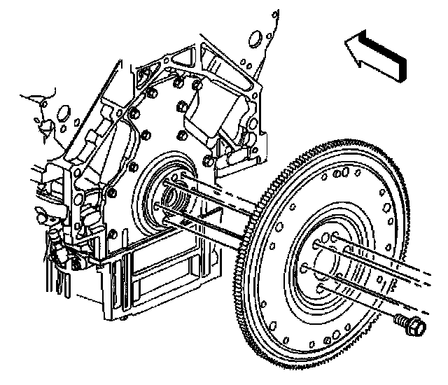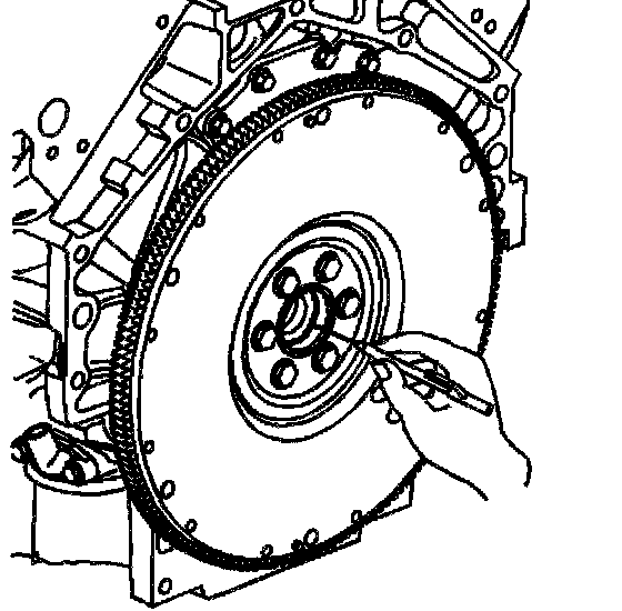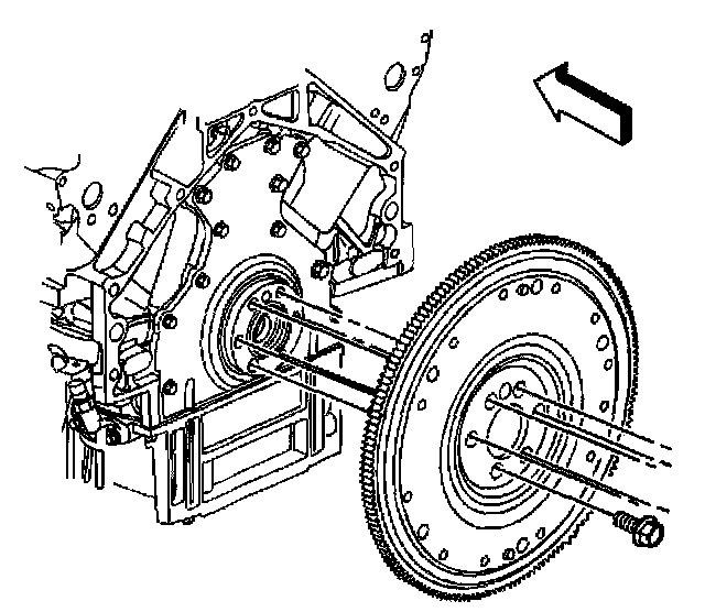 ^ For manual transmission applications, note the position and direction of the engine flywheel before removal. The flywheel does not use a locating pin for alignment. Mark or scribe the end of the crankshaft and the flywheel before component removal. The engine flywheel must be reinstalled to the original position and direction. The engine flywheel will not initially seat against the crankshaft flange, but will be pulled onto the crankshaft by the engine flywheel bolts. This procedure requires a 3 stage tightening process.