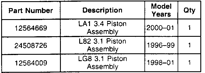 Do not install pistons in model years other than listed in the parts table shown. The design of the LA1 piston assembly is unique to those model years listed. Damage to the piston, cylinder block or cylinder head may occur if the wrong piston is installed.