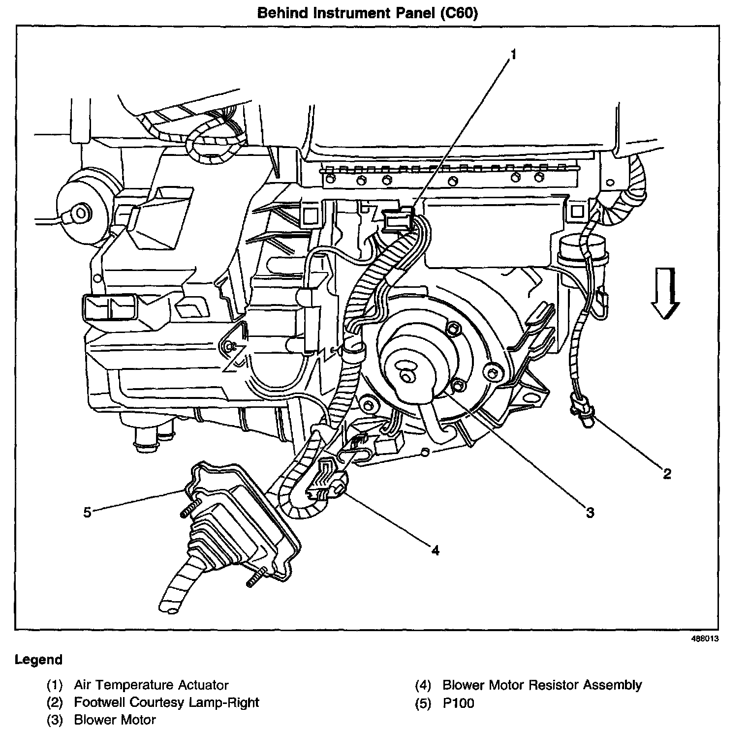 Right lower corner of the passenger compartment bulkhead, near the blower motor