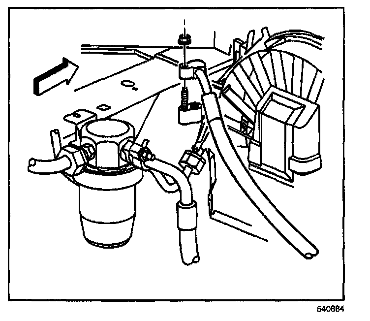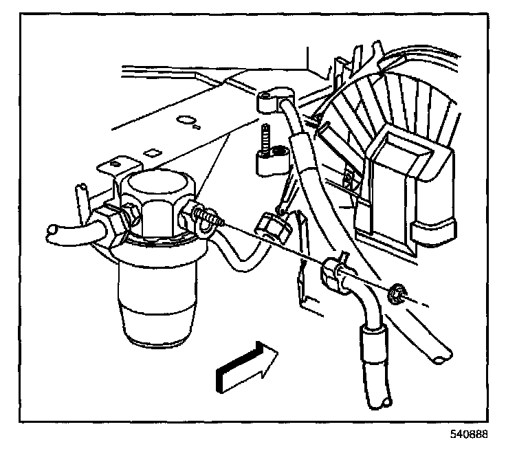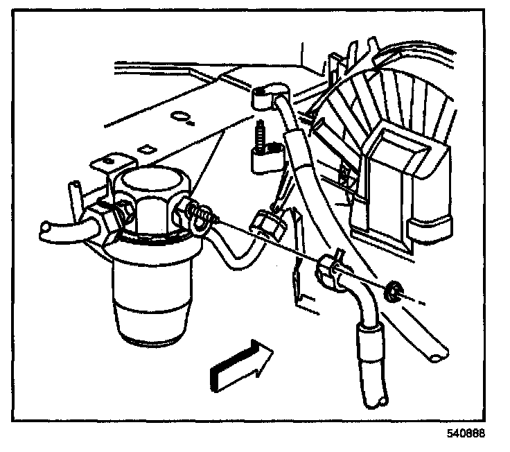 4. Remove the A/C compressor hose nut from the accumulator and position the A/C compressor hose aside.