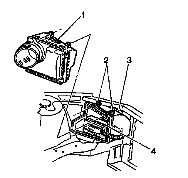 1. Carefully install the PCM housing by pushing the housing into the 2 rubber grommets (2) in the engine compartment.