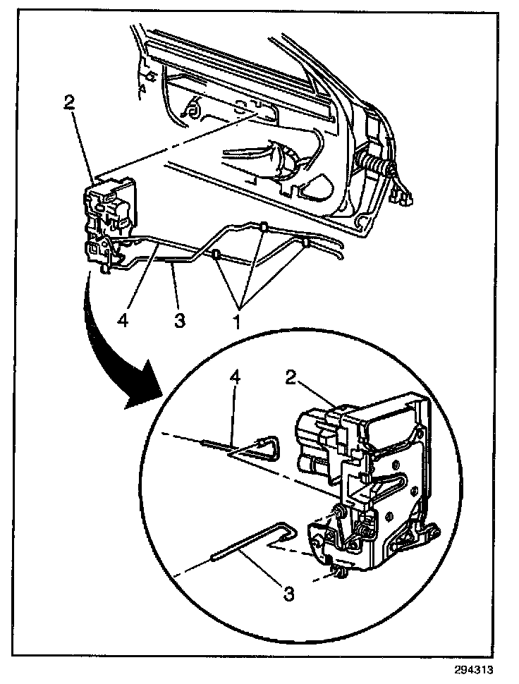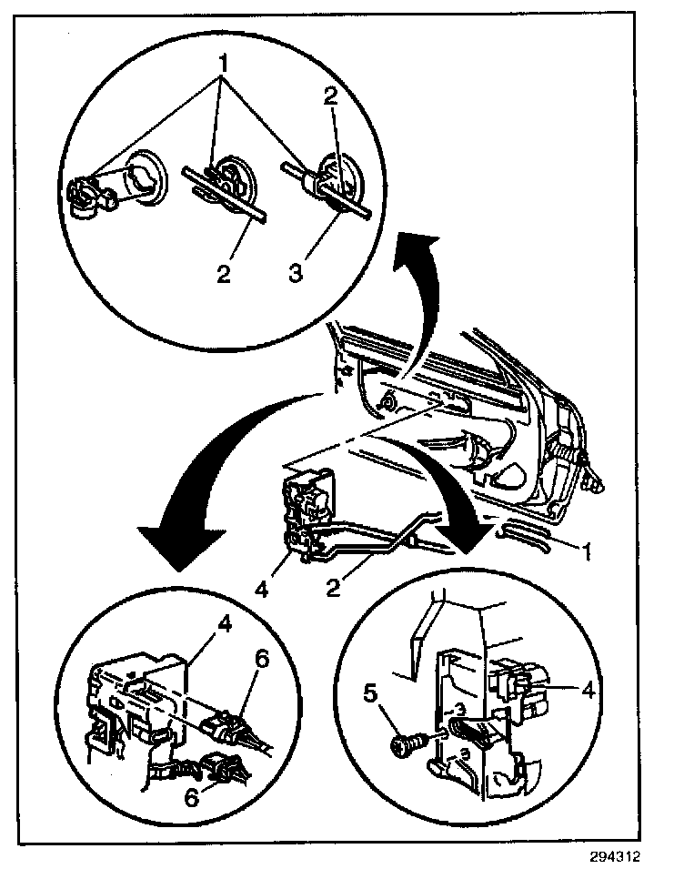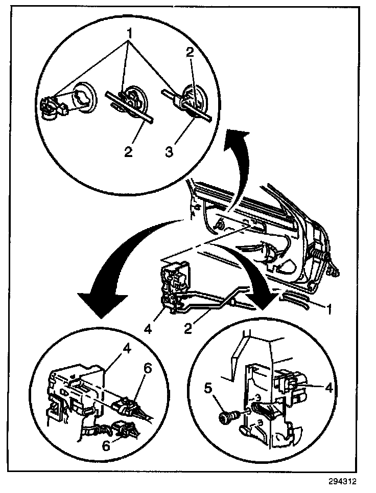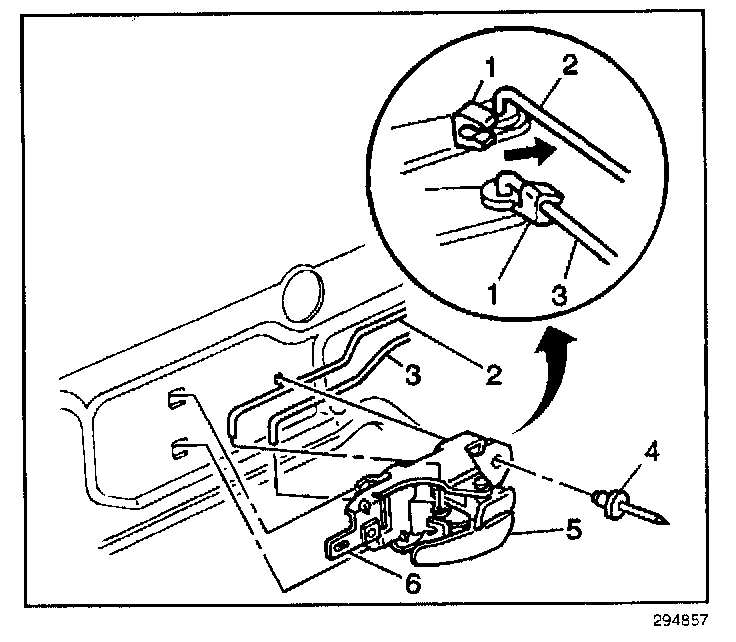 5. Remove the door handle clips (1) from the lock rod (2) and the handle rod (3). Remove the rods from the door handle.