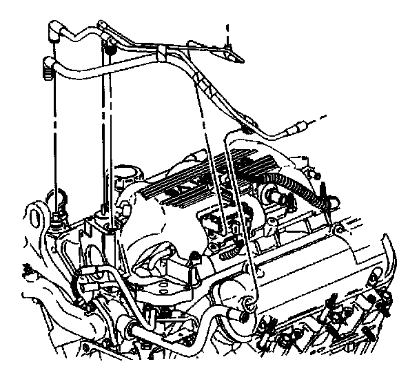 16. Remove the ignition coil bracket with the coils, the purge solenoid, the vacuum canister solenoid, the vacuum lines, and the electrical connections. Refer to Ignition Control Module Replacement and EVAP Canister Purge Valve Replacement in Powertrain Management.