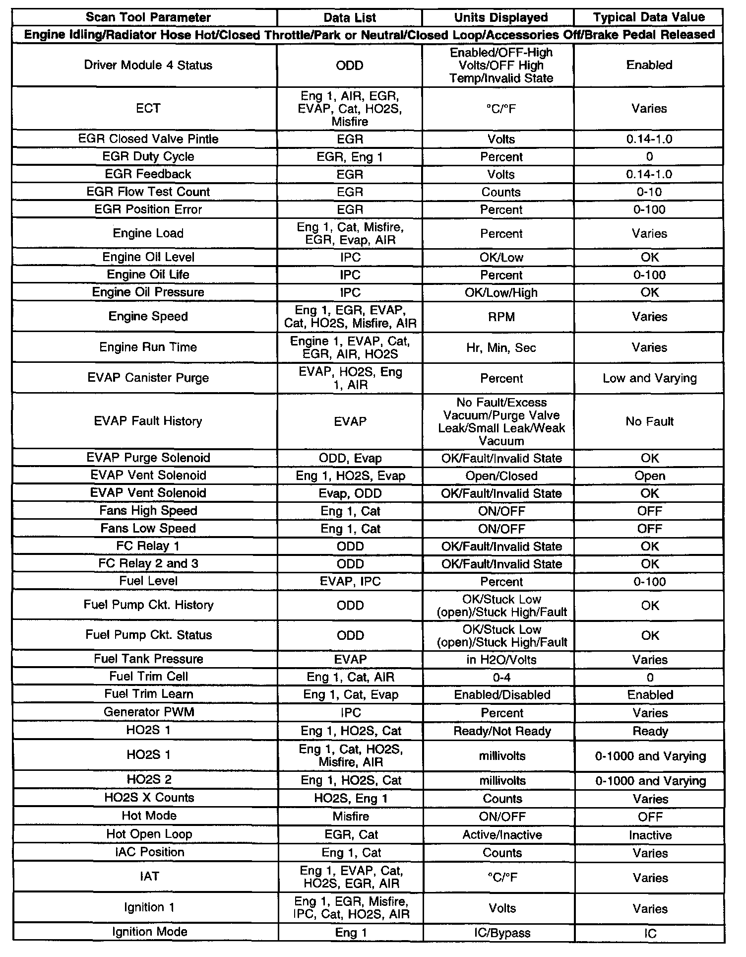 Scan tool values from a properly running engine may be used for comparison with the engine you are diagnosing. The Engine Scan Tool Data List represents values that would be seen on a normally running engine.