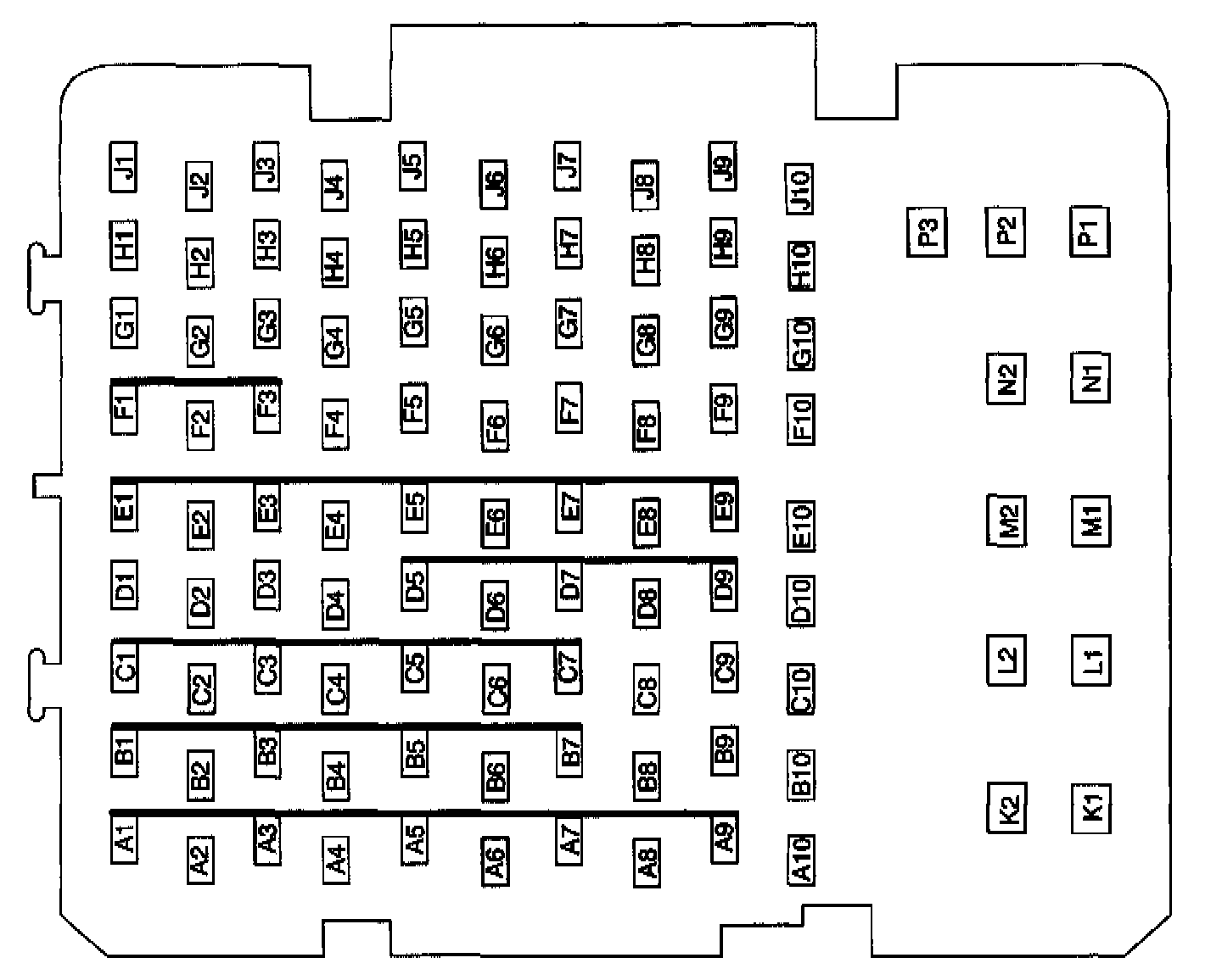 Instrument Panel Fuse Block (Bottom View):