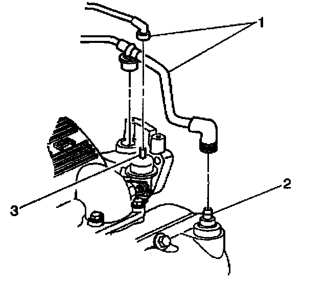 6. Install the vacuum hose (1),to the fuel pressure regulator (3) and the crankcase ventilation valve (2).