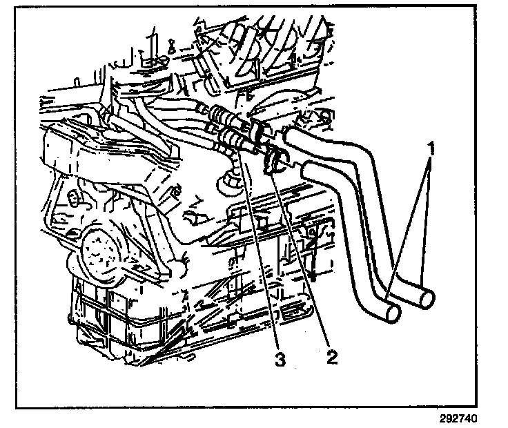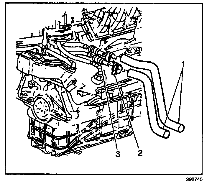 2. Squeeze the tabs on the quick-connect (3) in order to disconnect the heater hose (1) from the heater pipe.