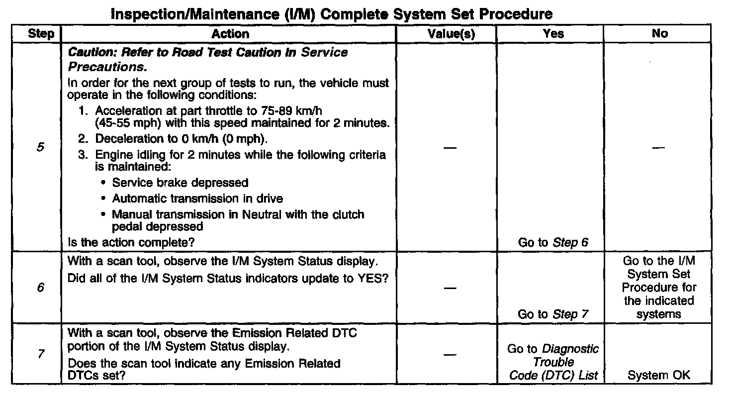 7. The I/M System Status only reports on whether or not a diagnostic has run, not the outcome of the test. If any emission related DTC sets after the tests are complete, the DTC will require diagnosis.