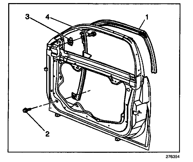 6. Remove the window channel bolts (2,4) from the window run channel (1).