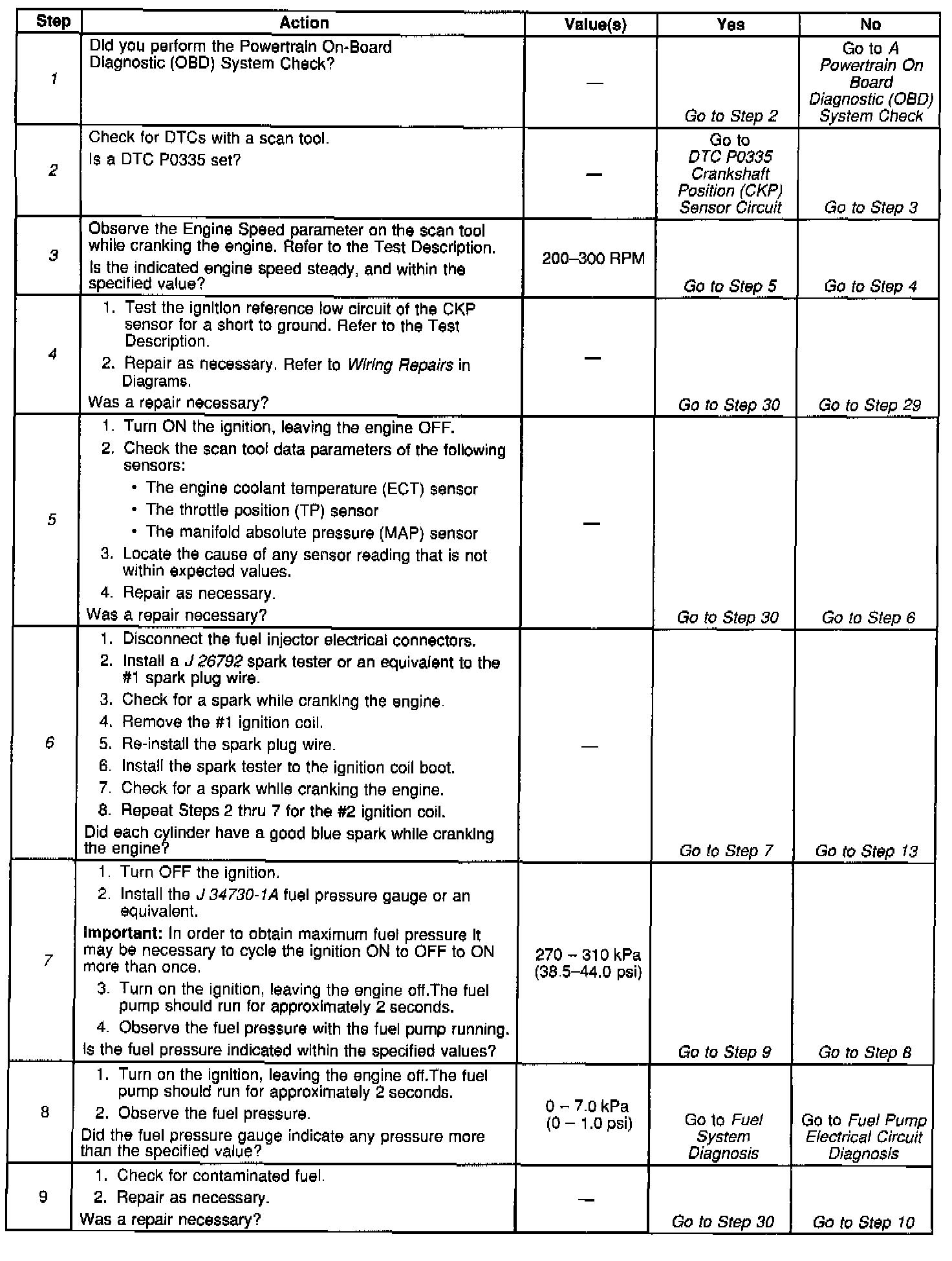 5. This step checks the TP sensor, the ECT sensor, and the MAP sensor for a faulty signal. A faulty sensor input to the PCM may cause a fueling condition that results in a no start.