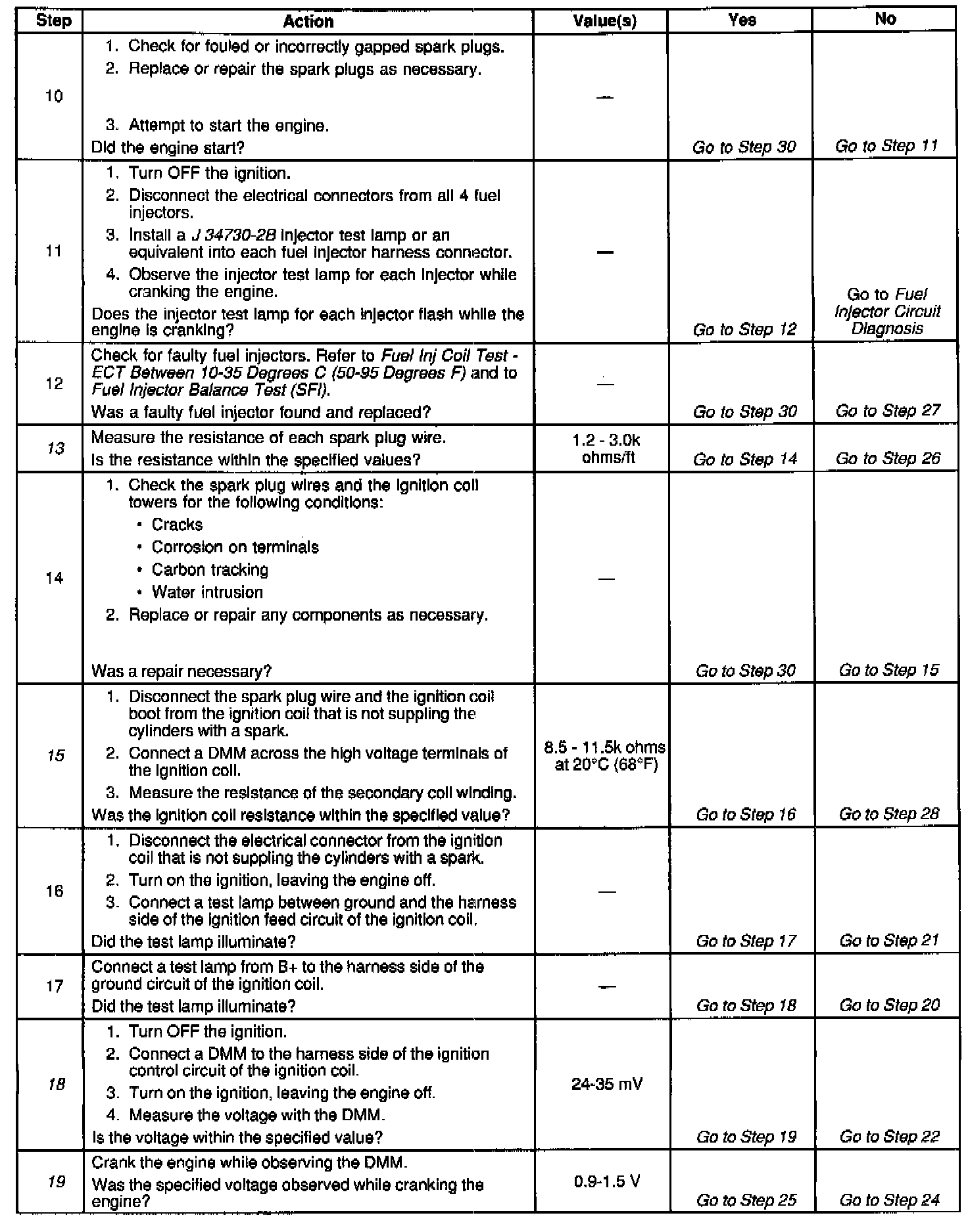 19. This step checks for an ignition signal from the PCM while cranking the engine. The PCM sends a fluctuating voltage to the ignition coils after determining the engine speed from the CKP sensor.