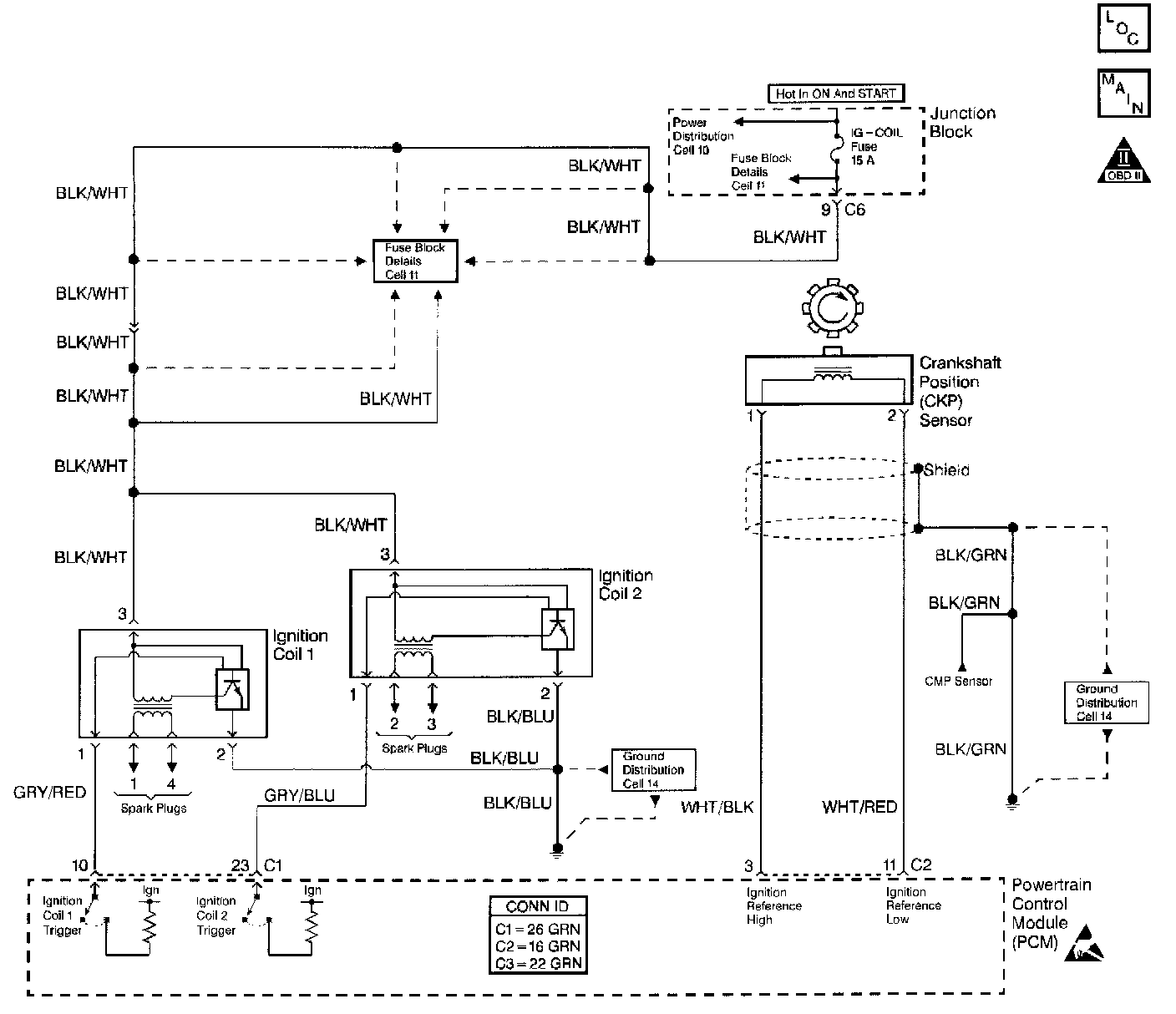 2. The PCM uses the CKP sensor for engine reference. Without engine reference signals there is not any spark or any fuel injector pulse. DTC P0335 sets after 3 seconds of cranking the engine if the CKP sensor signal is not present.