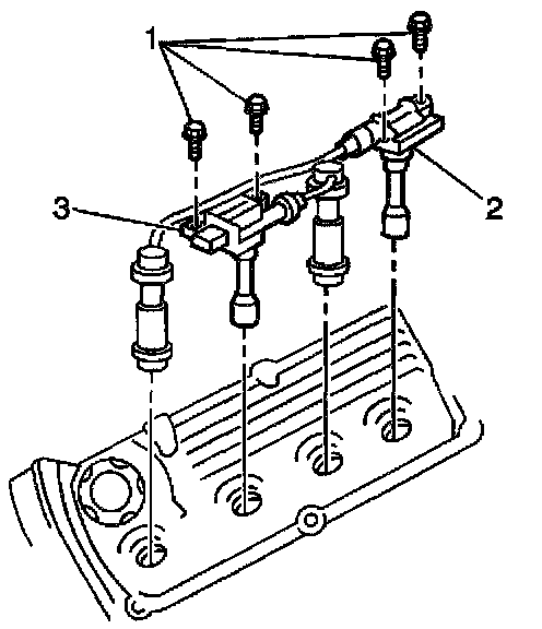 3. Remove the 2 bolts (1) that secure the #1 ignition coil (2) or the #2 ignition coil (3) to the valve cover.