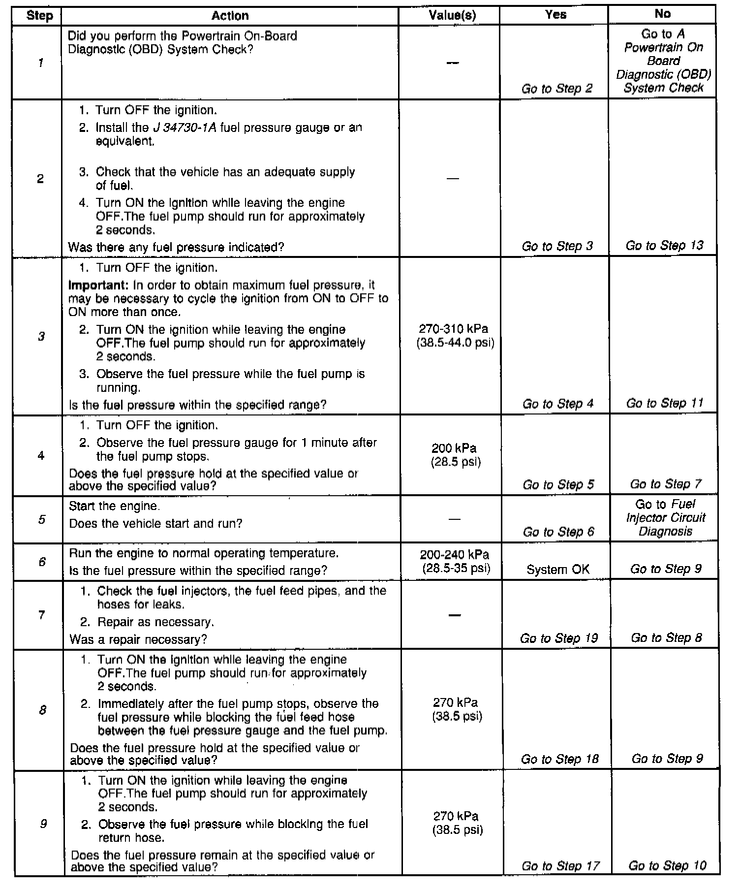 13. A fault in the fuel pump electrical circuit may be caused by low fuel pressure or by zero fuel pressure. Go to the Fuel Pump Electrical Circuit Diagnosis in order to diagnose the fuel pump electrical circuit. Component Tests and General Diagnostics