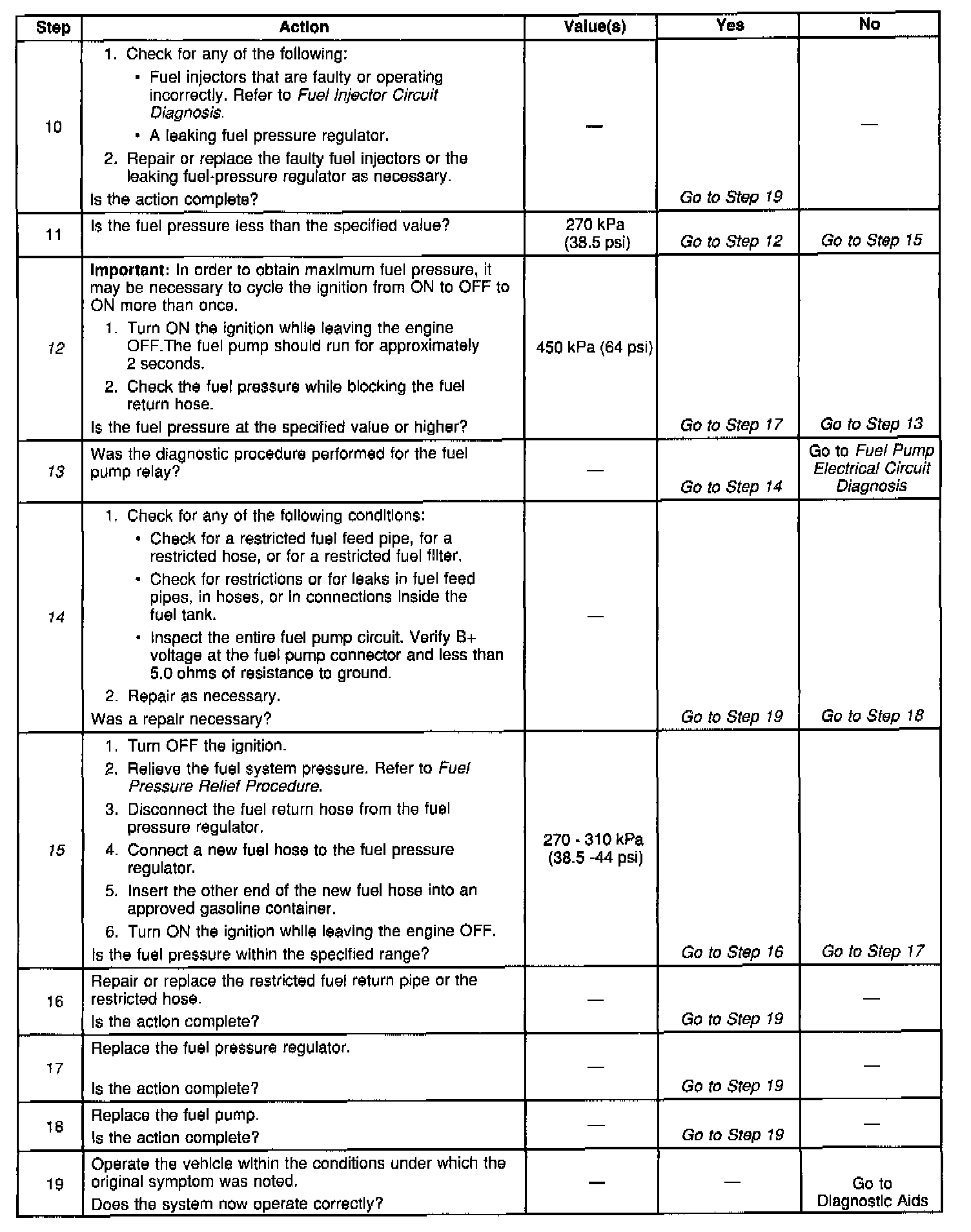 14. This step checks for conditions except for a faulty fuel pump that can cause low fuel pressure. Check for any restrictions or for any blockages in the fuel feed lines and in the hoses, including those inside the fuel tank. Check the fuel pump electrical circuit for excessive resistance. Correct fuel pump operation requires correct voltage and adequate current flow.
