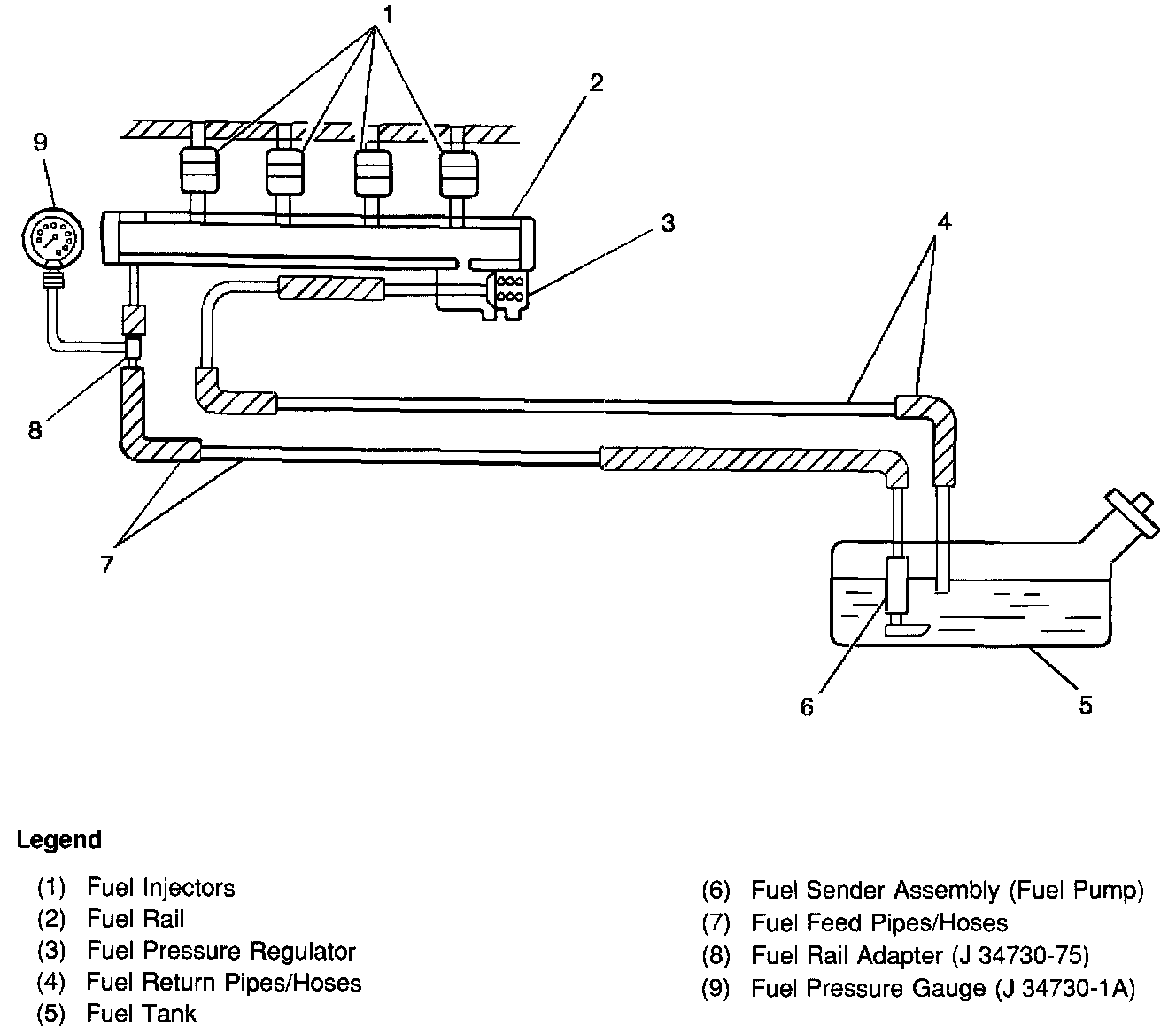 The fuel pump delivers fuel to the fuel injectors in the fuel rail at a controlled pressure. The controlled pressure is 270-310 kPa (38.5-44 psi) when the fuel pump is energized and the engine is not running. The controlled pressure is 200-240 kPa (28.5-34 psi) when the engine is idling at normal operating temperatures. The fuel-pressure regulator maintains the correct fuel pressure at all times by returning excess fuel to the fuel tank.