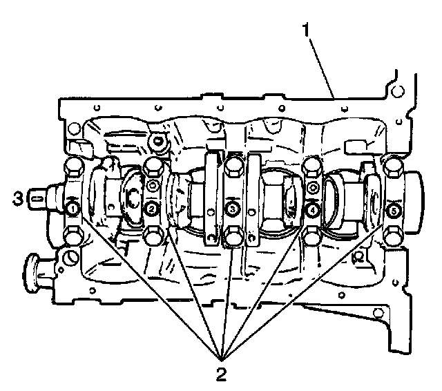 Install the five main bearing caps (2) with the lower inserts and secure with the ten main bearing cap bolts in order 1, 2, 3, 4 and 5.