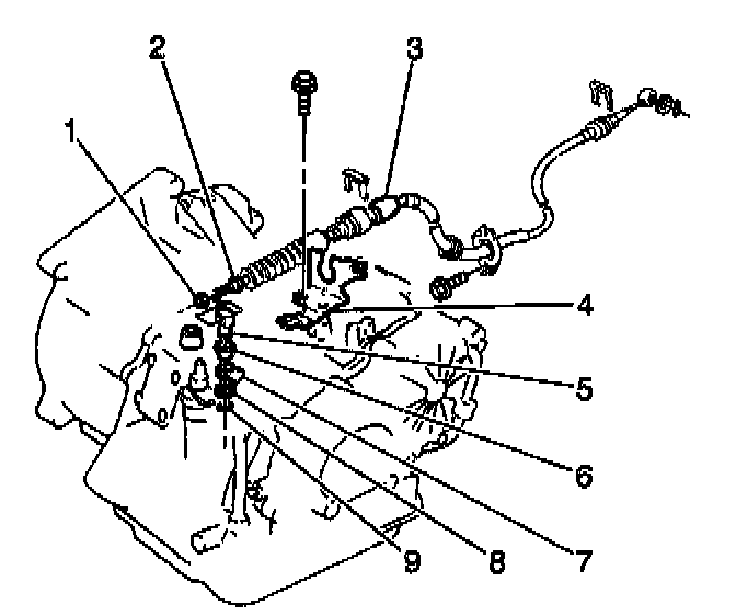 1. Install the shift select cable (3) and the grommet through the bulkhead. Secure the cable with 2 bolts.