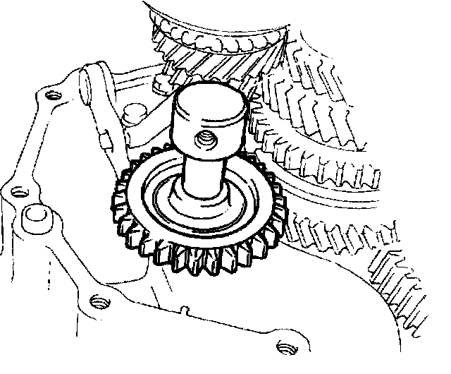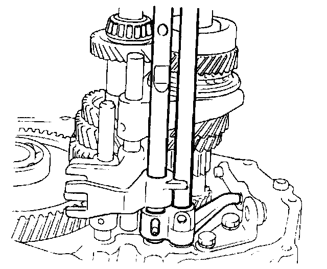 40. Engage the 5th gear by sliding the 5th speed sleeve down. The transaxle is now locked in two gears. This prevents rotation of the input shaft and permits installation of the countershaft nut