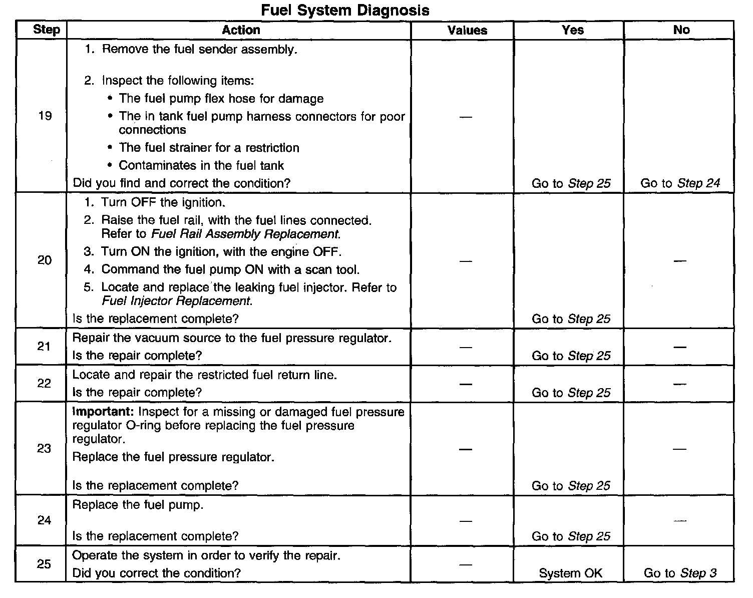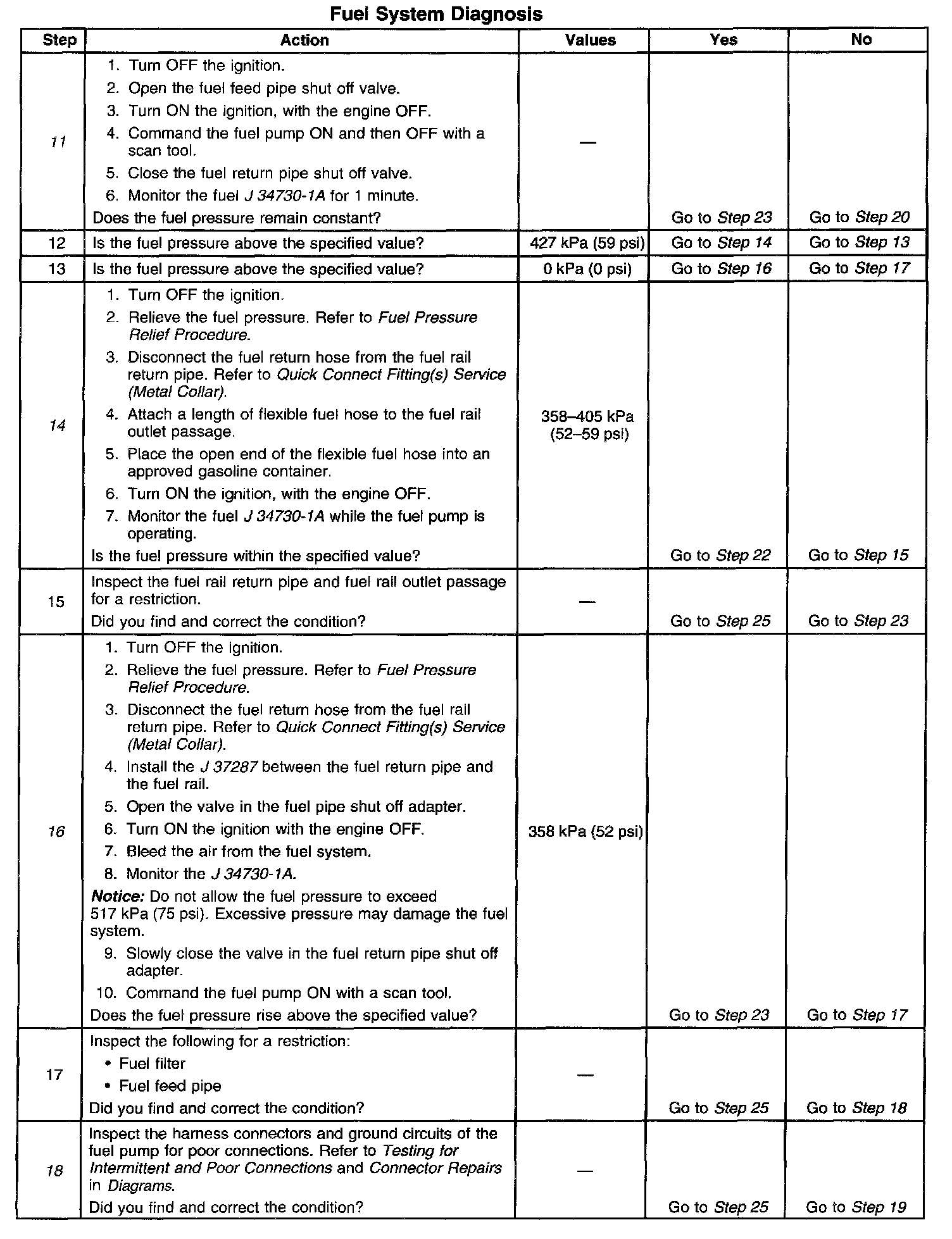 14. This step tests for a restricted fuel return pipe. If the fuel pressure is within the specified values, a restriction in the fuel return pipe is indicated.