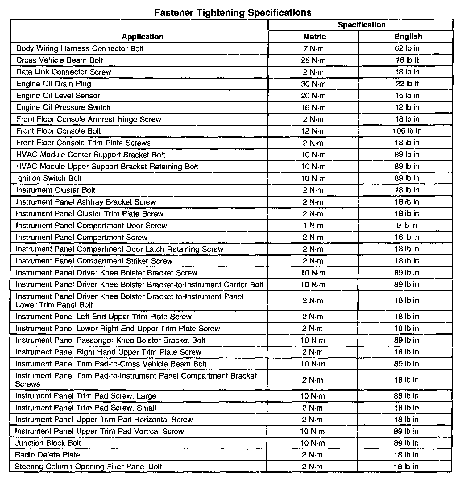 Fastener Tightening Specifications: