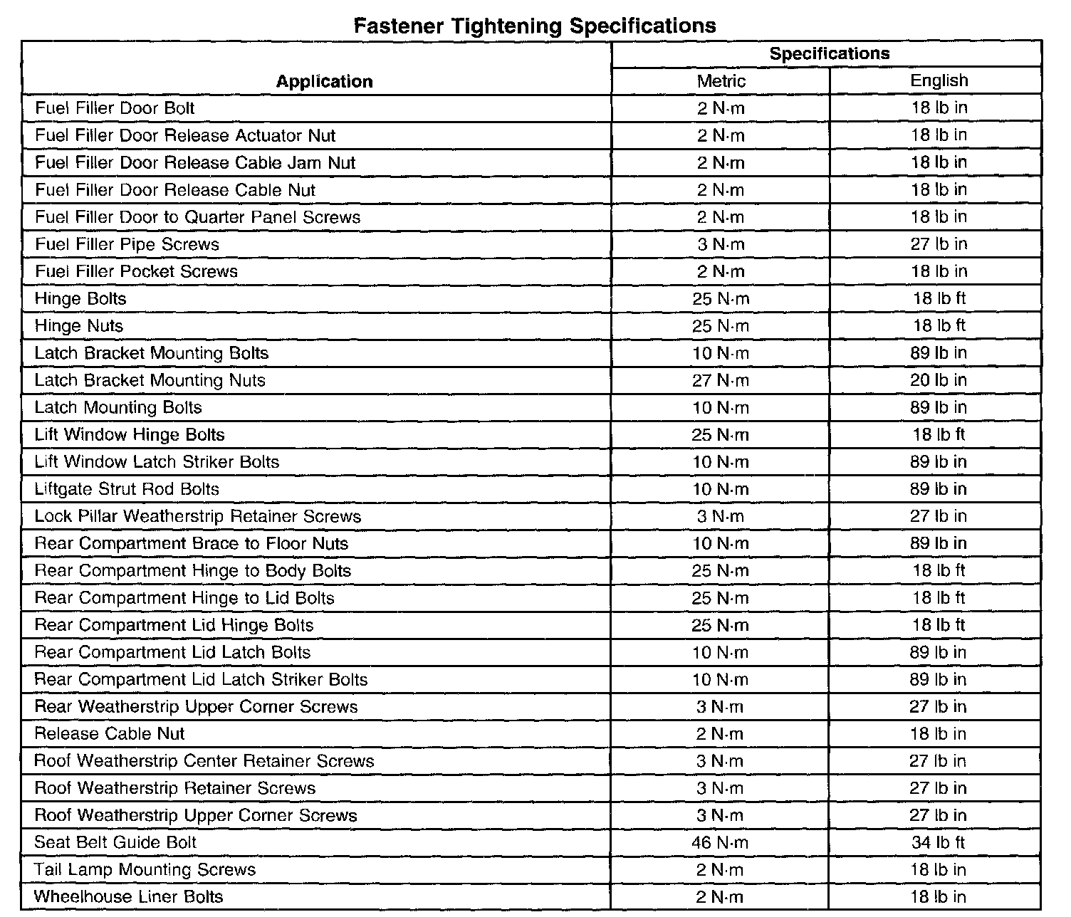 Fastener Tightening Specifications:
