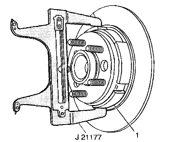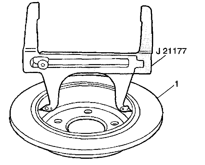 6. Set the J21177-A inside of the park brake drum portion of the brake rotor (1) at the widest point.