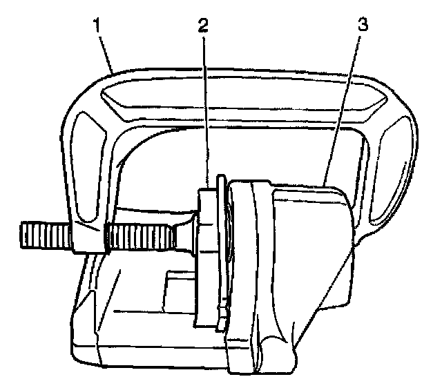 ^ For single piston caliper applications, insert a discarded inner brake pad (2) or block of wood in front of the piston. Using a large C-clamp (1) installed over the body of the caliper (3) and against the brake pad or block of wood, slowly bottom the piston in the bore.