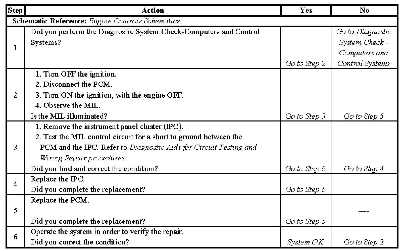 2. This step determines if the condition is with the MIL control circuit or the PCM.