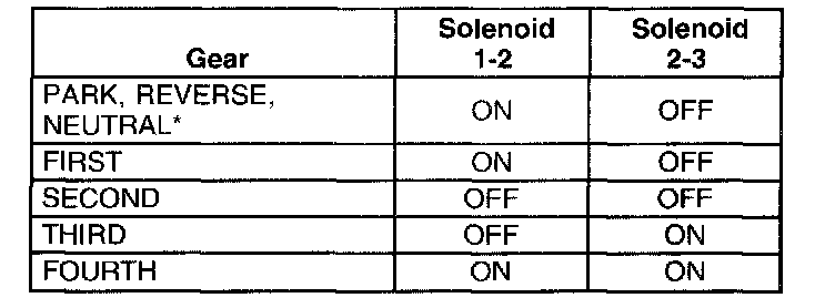Important: The solenoid states are normally ON (1-2) and OFF (2-3) in the P, R, and N gears. However, these may change based on the vehicle speed and the throttle position.