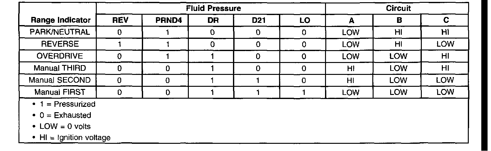 Five of the fluid pressure switches are normally-open. These are used to indicate the position of the manual valve. The PCM uses this information to control line pressure, TCC apply and release and shift solenoid operation.