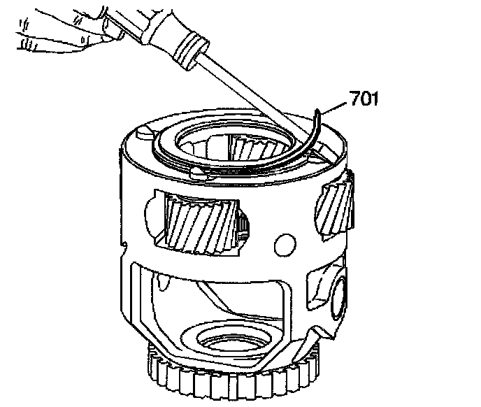 8. Install the final drive carrier spiral retaining ring (701) in order to retain the planet pinion gear pins.