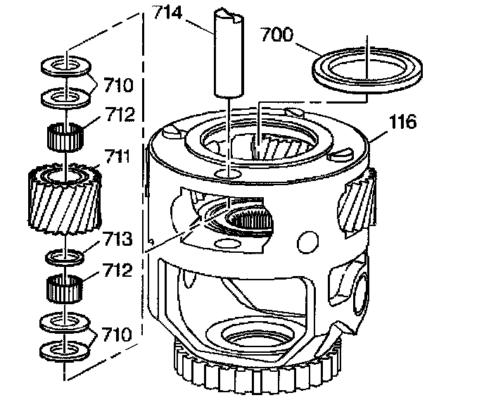 7. Install the planet pinion gear pins (714) into the final drive carrier (116) in order to retain the planet pinion gears (711).