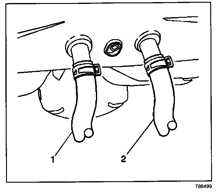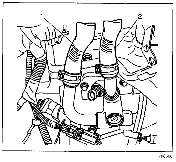 1. Connect the inlet heater hose (2) to the inlet port of the heater core.