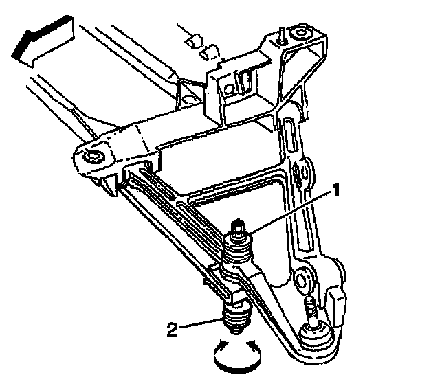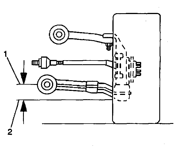 4. Use the J 42854 in order to measure the distance between the lowest point of the ball joint (2) and the center of the front side of the lower control arm mounting bolt (1).