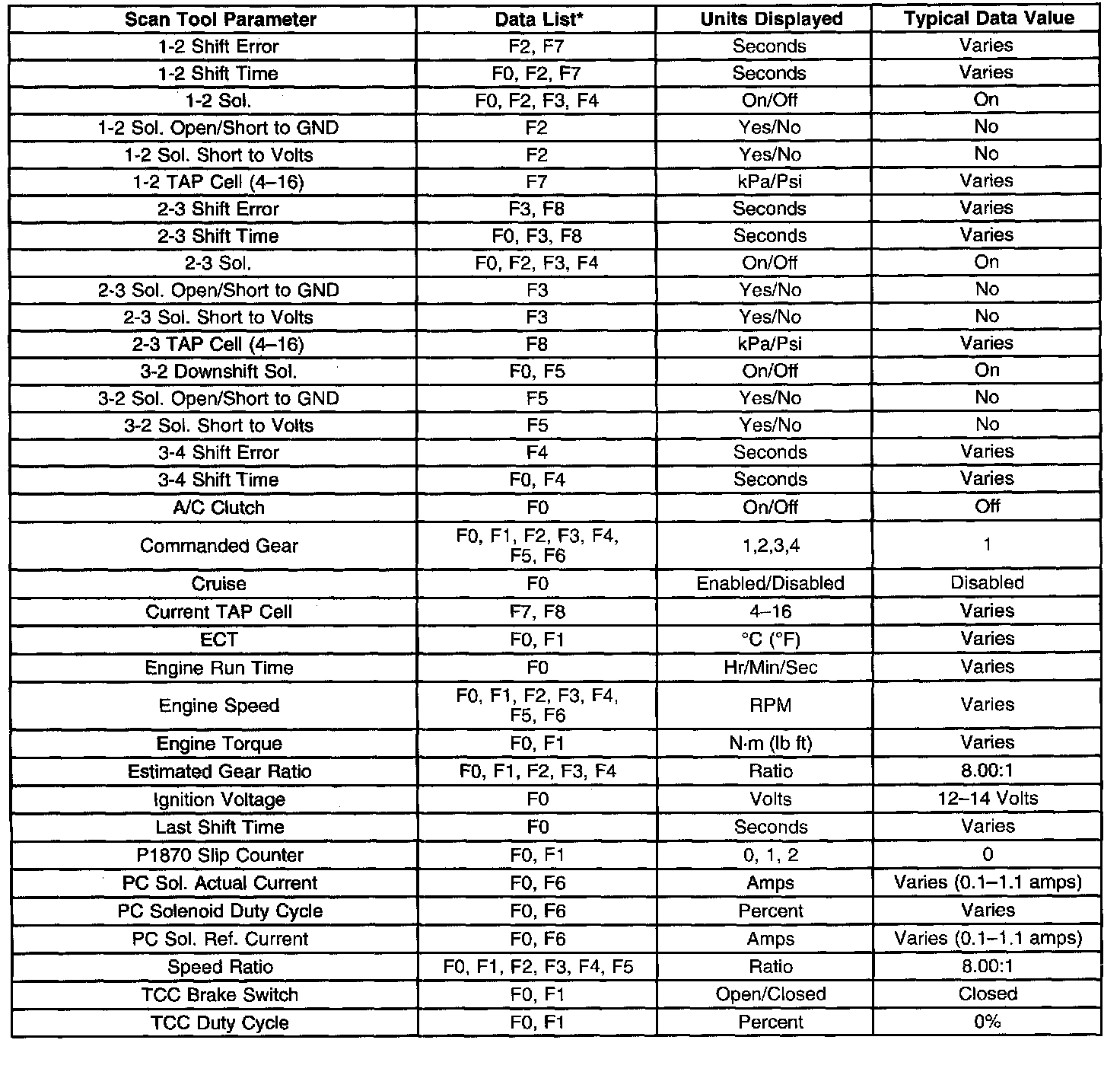 Only the parameters listed below are used for diagnosing. If a scan tool displays other parameters, the values are not recommended by General Motors for use in diagnosis. Scan tool values below were recorded under the following conditions: