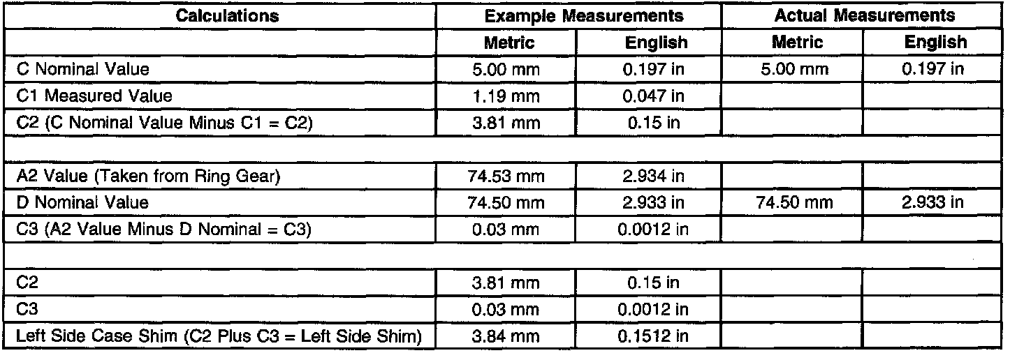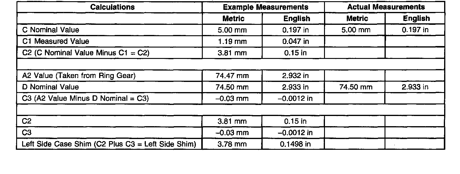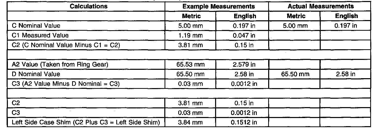 Differential Case Left Side Shim Calculation Table with an A2 Value Less Than 65.5 mm (2.58 inch) 3.15/3.42 Ratio Axles